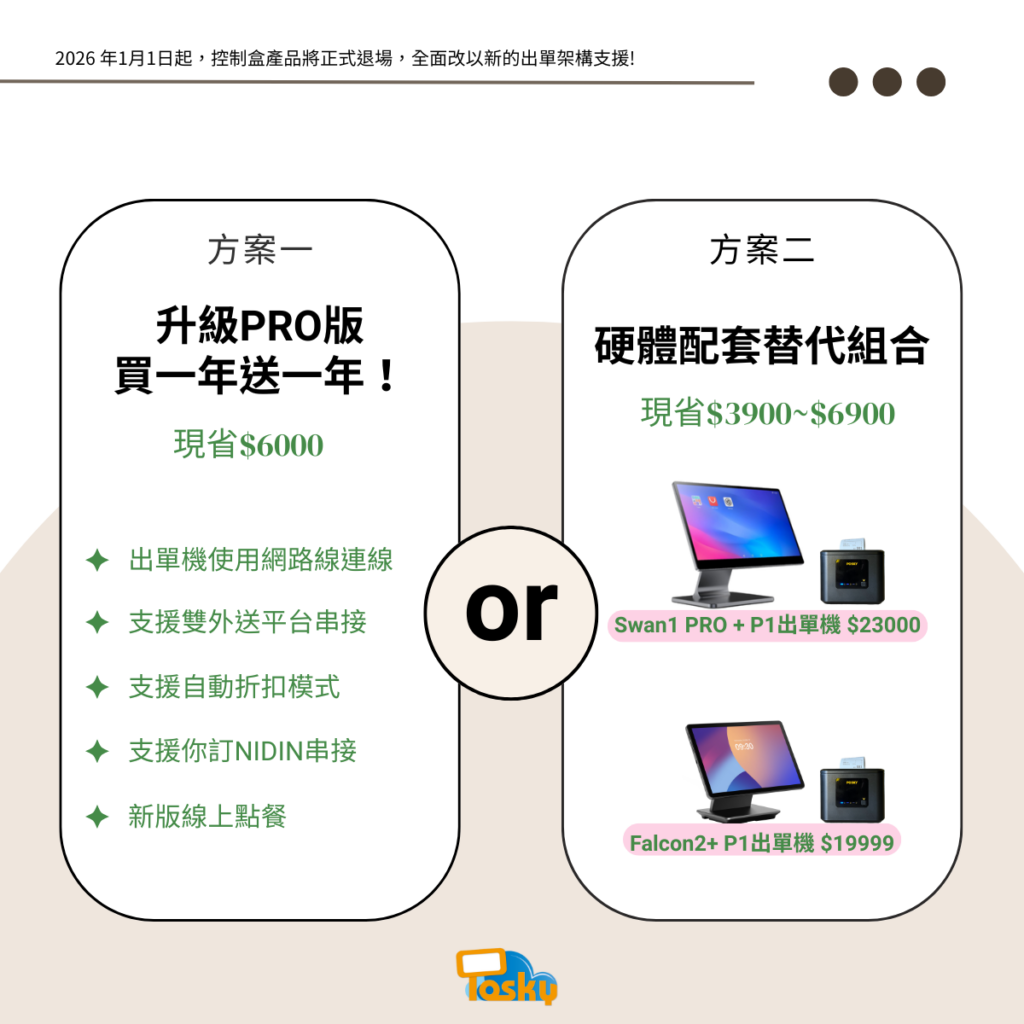 升級至POSKY PRO 多主機網路直連架構,可免除控制盒需求,享有更穩定安全的出單體驗,以及更豐富的功能體驗。